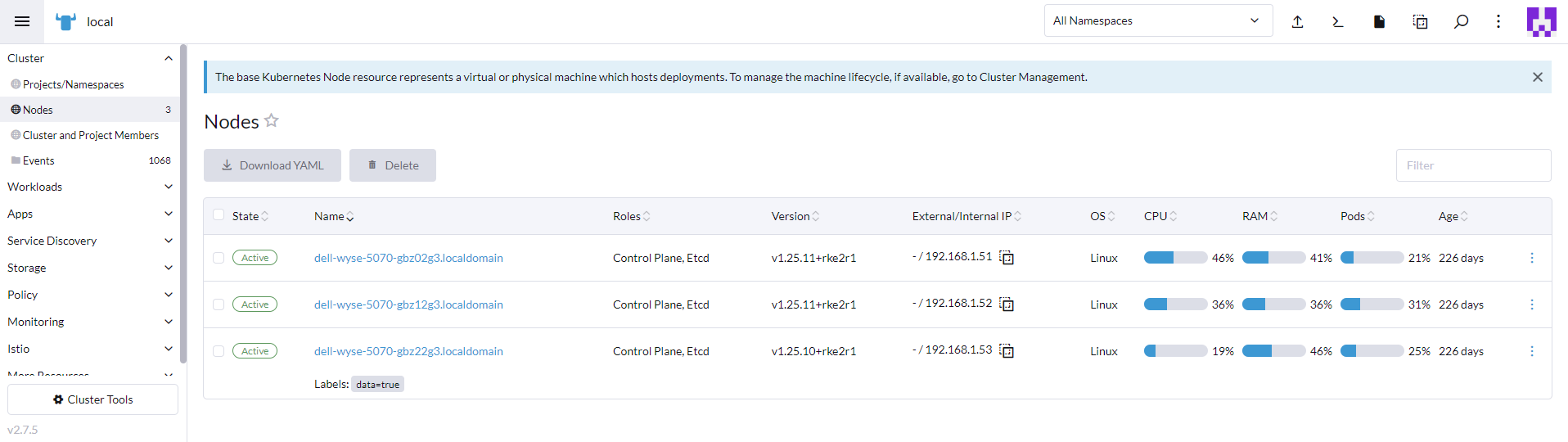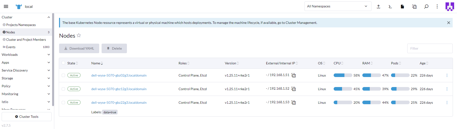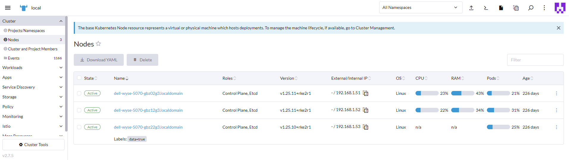 root@dell-wyse-5070-gbz02g3:~$ whereis crictl crictl: /var/lib/rancher/rke2/data/v1.25.11-rke2r1-5ec8deb7122b/bin/crictl root@dell-wyse-5070-gbz02g3:~$ ls -la /var/lib/rancher/rke2/data/v1.25.11-rke2r1-5ec8deb7122b/bin/crictl -rwxr-xr-x 1 root root 38483024 Jul 4 02:56 /var/lib/rancher/rke2/data/v1.25.11-rke2r1-5ec8deb7122b/bin/crictl root@dell-wyse-5070-gbz02g3:~$ ls -la /var/lib/rancher/rke2/data/v1.25.11-rke2r1-5ec8deb7122b/bin/ total 320952 drwxr-xr-x 2 root root 4096 Jul 4 02:56 . drwxr-xr-x 4 root root 4096 Jul 4 02:56 .. -rwxr-xr-x 1 root root 59563056 Jul 4 02:56 containerd -rwxr-xr-x 1 root root 8527032 Jul 4 02:56 containerd-shim -rwxr-xr-x 1 root root 10217176 Jul 4 02:56 containerd-shim-runc-v1 -rwxr-xr-x 1 root root 14011856 Jul 4 02:56 containerd-shim-runc-v2 -rwxr-xr-x 1 root root 38483024 Jul 4 02:56 crictl -rwxr-xr-x 1 root root 20968336 Jul 4 02:56 ctr -rwxr-xr-x 1 root root 49232200 Jul 4 02:56 kubectl -rwxr-xr-x 1 root root 116942168 Jul 4 02:56 kubelet -rwxr-xr-x 1 root root 10684792 Jul 4 02:56 runc root@dell-wyse-5070-gbz02g3:~$ kubectl get no -o wide NAME STATUS ROLES AGE VERSION INTERNAL-IP EXTERNAL-IP OS-IMAGE KERNEL-VERSION CONTAINER-RUNTIME dell-wyse-5070-gbz02g3.localdomain Ready control-plane,etcd,master 226d v1.25.11+rke2r1 192.168.1.51 Ubuntu 22.04.2 LTS 5.15.0-75-generic containerd://1.7.1-k3s1 dell-wyse-5070-gbz12g3.localdomain Ready control-plane,etcd,master 226d v1.25.11+rke2r1 192.168.1.52 Ubuntu 22.04.2 LTS 5.15.0-75-generic containerd://1.7.1-k3s1 dell-wyse-5070-gbz22g3.localdomain Ready control-plane,etcd,master 226d v1.25.11+rke2r1 192.168.1.53 Ubuntu 22.04.2 LTS 5.15.0-75-generic containerd://1.7.1-k3s1 root@dell-wyse-5070-gbz02g3:~$