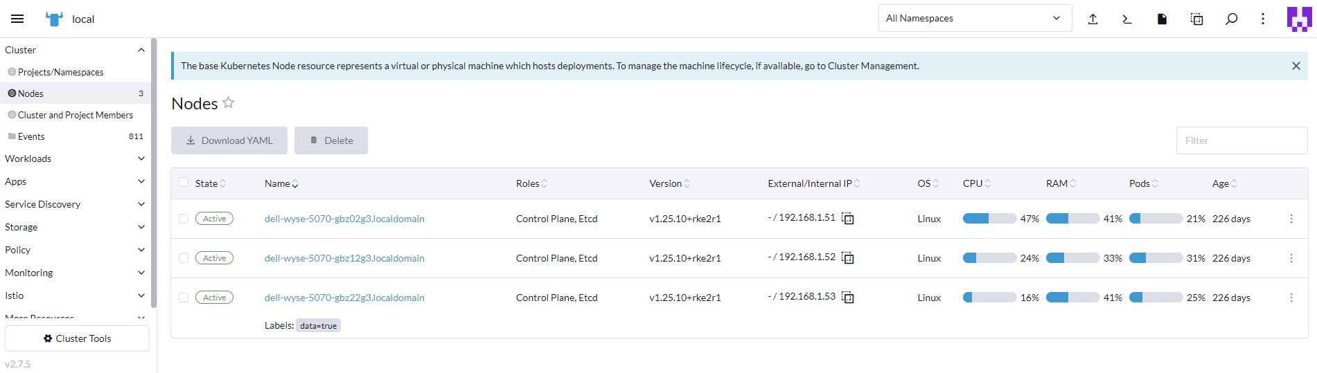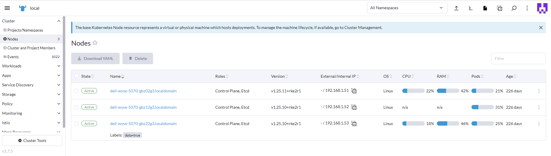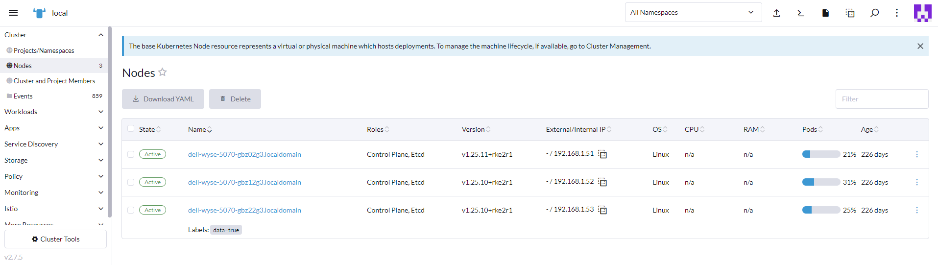 root@dell-wyse-5070-gbz02g3:~$ whereis crictl crictl: /var/lib/rancher/rke2/data/v1.25.11-rke2r1-5ec8deb7122b/bin/crictl root@dell-wyse-5070-gbz02g3:~$ ls -la /var/lib/rancher/rke2/data/v1.25.11-rke2r1-5ec8deb7122b/bin/crictl -rwxr-xr-x 1 root root 38483024 Jul 4 02:56 /var/lib/rancher/rke2/data/v1.25.11-rke2r1-5ec8deb7122b/bin/crictl root@dell-wyse-5070-gbz02g3:~$ ls -la /var/lib/rancher/rke2/data/v1.25.11-rke2r1-5ec8deb7122b/bin/ total 320952 drwxr-xr-x 2 root root 4096 Jul 4 02:56 . drwxr-xr-x 4 root root 4096 Jul 4 02:56 .. -rwxr-xr-x 1 root root 59563056 Jul 4 02:56 containerd -rwxr-xr-x 1 root root 8527032 Jul 4 02:56 containerd-shim -rwxr-xr-x 1 root root 10217176 Jul 4 02:56 containerd-shim-runc-v1 -rwxr-xr-x 1 root root 14011856 Jul 4 02:56 containerd-shim-runc-v2 -rwxr-xr-x 1 root root 38483024 Jul 4 02:56 crictl -rwxr-xr-x 1 root root 20968336 Jul 4 02:56 ctr -rwxr-xr-x 1 root root 49232200 Jul 4 02:56 kubectl -rwxr-xr-x 1 root root 116942168 Jul 4 02:56 kubelet -rwxr-xr-x 1 root root 10684792 Jul 4 02:56 runc root@dell-wyse-5070-gbz02g3:~$ kubectl get no -o wide NAME STATUS ROLES AGE VERSION INTERNAL-IP EXTERNAL-IP OS-IMAGE KERNEL-VERSION CONTAINER-RUNTIME dell-wyse-5070-gbz02g3.localdomain Ready control-plane,etcd,master 226d v1.25.11+rke2r1 192.168.1.51 Ubuntu 22.04.2 LTS 5.15.0-75-generic containerd://1.7.1-k3s1 dell-wyse-5070-gbz12g3.localdomain Ready control-plane,etcd,master 226d v1.25.11+rke2r1 192.168.1.52 Ubuntu 22.04.2 LTS 5.15.0-75-generic containerd://1.7.1-k3s1 dell-wyse-5070-gbz22g3.localdomain Ready control-plane,etcd,master 226d v1.25.11+rke2r1 192.168.1.53 Ubuntu 22.04.2 LTS 5.15.0-75-generic containerd://1.7.1-k3s1 root@dell-wyse-5070-gbz02g3:~$